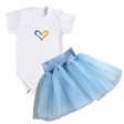 Комплект включає в себе: боді з вишитим сердечком синьо-жовтими кольорами та спідничку блакитного кольору