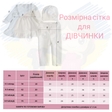 В комплект входить: плаття з воланчиками, штанята, шапочка, пінетки та крижма