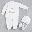 Усе необхідне в одному наборі: кофта, штани, шапочка, пінетки та крижма